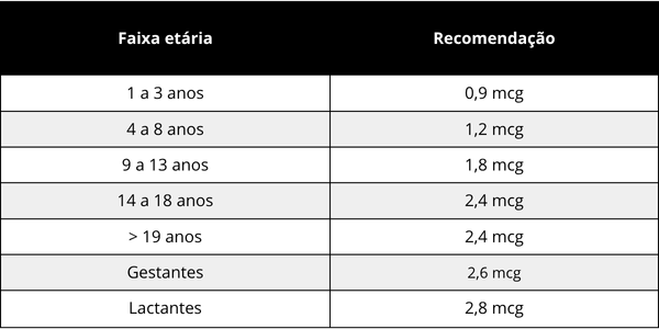 De acordo com as evidências atuais, o consumo de vitamina B12 no Brasil é suficiente, atendendo a necessidade diária recomendada de 2,4 mcg para adultos1. Veja abaixo as quantidades necessárias para cada faixa etária3: